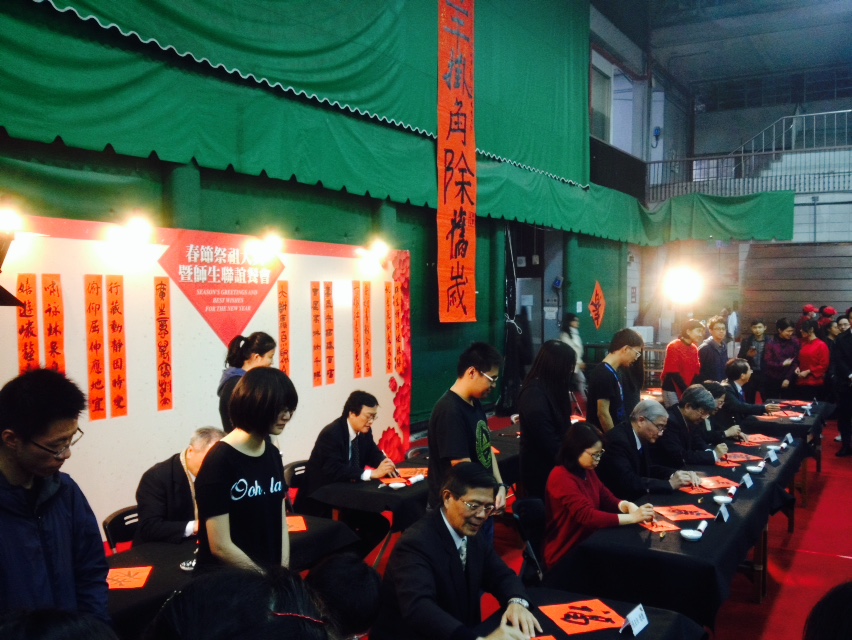 為期師生共同迎接農曆春節,105年元月15日(五)下午6時20分舉行揮毫迎春活動,假本校舊體育館舉行「春節祭祖大典暨師生聯誼餐會」。楊校長祝福全校師生猴年新春愉快,萬事如意。