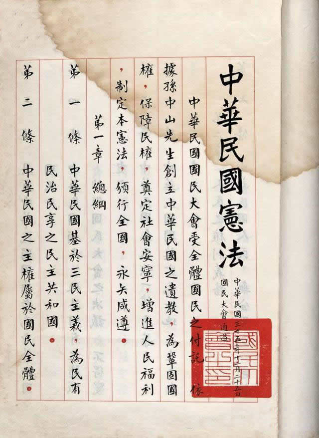 民國 36 年 01 月 01 日:中華民國國民大會受全體國民之付託,依據孫中山先生創立中華民國之遺教,為鞏固國權,保障民權,奠定社會安寧,增進人民福利,制定本憲法,頒行全國,永矢咸遵。